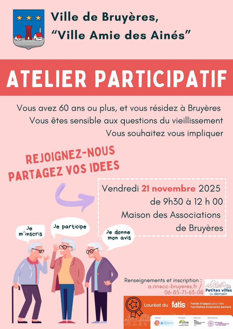 La ville de Bruyères organise un atelier participatif dans le cadre de sa démarche Ville Amie des Ainés. Il est ouvert à tous les habitants de Bruyères de 60 ans ou plus.