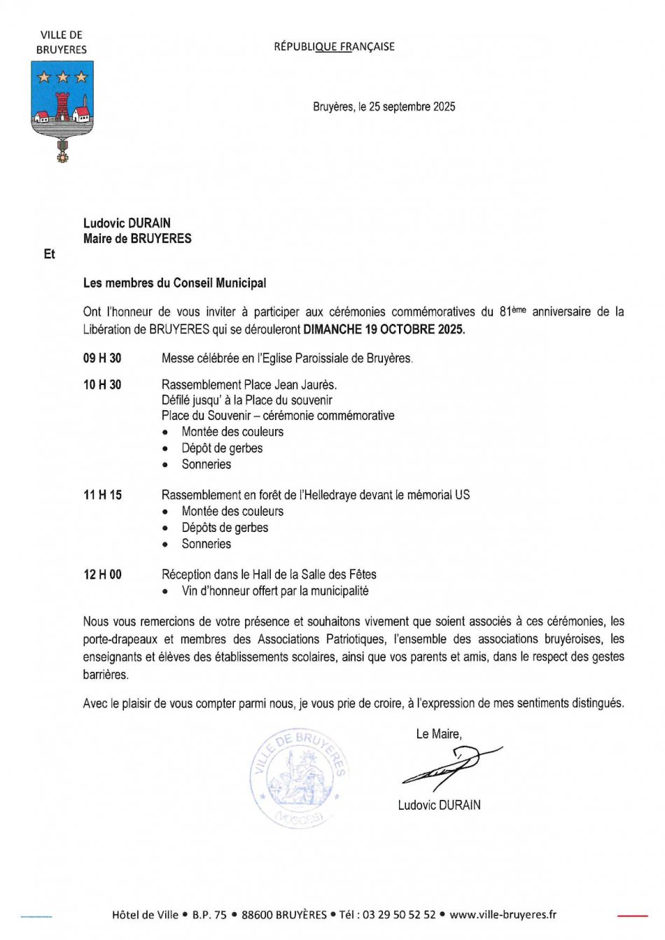 Invitation aux cérémonies commémoratives du 81ème anniversaire de la libération de bruyeres